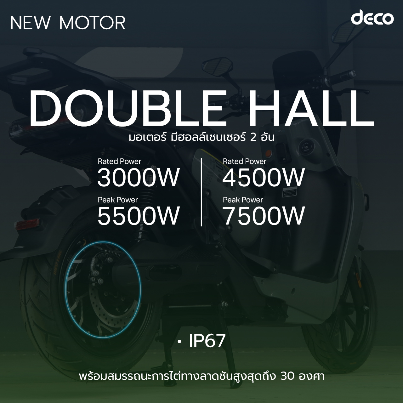 มอเตอร์แบบ Double Hall สำหรับขนาด 3000W และ 4500W มาตรฐานกันน้ำ IP67 พร้อมความเร็วสูงสุด 120 กม./ชม. ในรุ่น S45 (Plus) ตอกย้ำสมรรถนะและเทคโนโลยีรถไฟฟ้ารุ่นใหม่จาก DECO